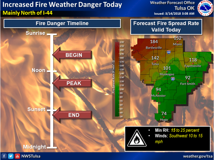 A combination of gusty winds and a warm front that will push temperatures above 70 degrees will increase the risk of wildfires through Friday in northeast Oklahoma.