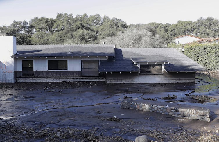 Downpours sent mud and boulders roaring down hills after a wildfire stripped them of vegetation in Southern California in 2017. (AP Photo/Marcio Jose Sanchez)