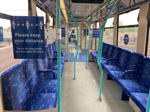 6月8日の英ロンドン中心部の電車では、20ほどの座席がある車両に1人しか乗車していなかった。人同士の距離を取ることを促すサインがあちこちに貼られている