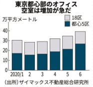 とりわけ都心5区(千代田、中央、港、新宿、渋谷)は3月以降、空室増加ペースが速い。23区全体の空室増加面積は2月が直近で最小の約28万平方メートルで、うち5区は約16万平方メートルだった。6月は23区で約39万平方メートルまで増えたが、うち5区は約27万平方メートルを占めた。